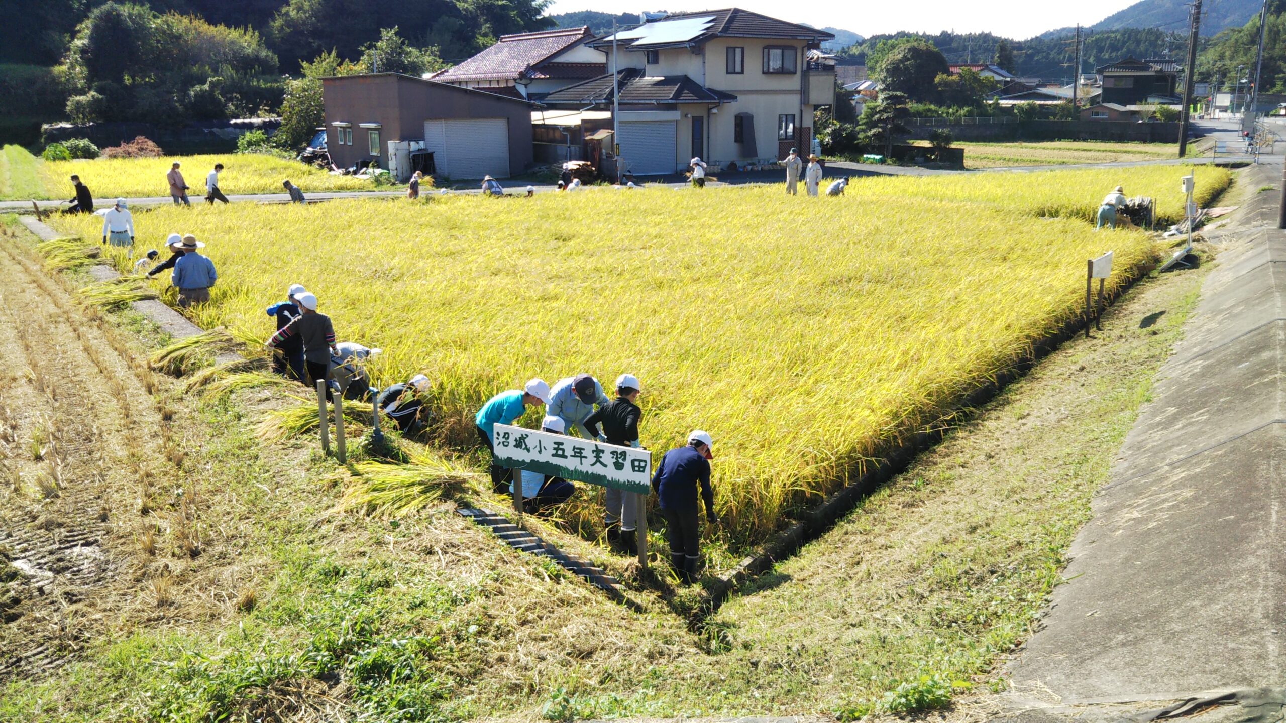 コヤマファームでは、地元小学校の地域連携教育の一つとして、農業体験授業を引き受けています。もともと地域の老人クラブと小学校との活動でおよそ40年前から地域の田んぼで続けられてきました。10年ほど前からコヤマファームの田んぼを実習田として、老人クラブの指導を受けながら、一緒になって、昔ながらの米づくり体験を学んでいます。